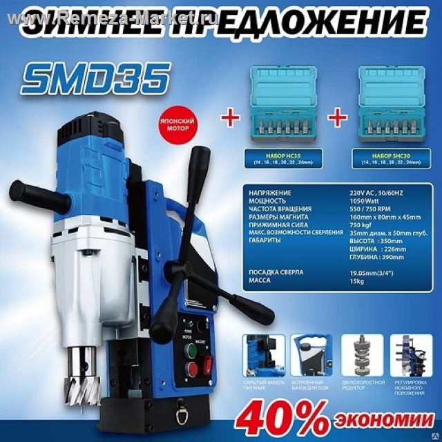 Уникальный в своем роде магнитный сверлильный станок SMD-35 предлагается с двумя пластиковыми кейсами, наполненными корончатыми сверлами 3Keego. В одном кейсе 6 сверл из быстрорежущей стали + 2 соответствующих им штифта, а в другом - 6 таких же диаметров, но твердосплавных. Эффективная длина (глубина сверления) быстрорезов - 30 мм, твердосплавов - 35 мм. Чем замечателен и почему уникален этот магнитный станок: нет ни одного другого станка, который позволил бы переключать скорость прямо на вращающемся редукторе. Правда под нагрузкой этого все равно не стоит делать, но постоянно нам приходят в ремонт станки с переломанными вилками переключателей. Причем грешат этим не только китайские, но и немецкие моторы. Люди не дожидаются, пока вал станка остановится и переключают скорости, результат, как говорится, не заставляет себя ждать. НО ТОЛЬКО НЕ С SMD-35 нет ни одного другого станка, в котором одновременно был бы скрыт провод питающий мотор и обеспечивалось движение сверлильной головки для регулировки начального положения сверла по высоте. Немецкие станки на букву F и A имеют двойные направляющие ласточкин хвост и позволяют регулировать высоту расположения сверла, помогая обходиться без удлинителей и сверлить как длинными спиральными сверлами, так и короткими корончатыми. Но их провода проложны к двигателю снаружи и являются легкой добычей работников, которые мечтают переносить станки за удобные петли из гофрированной трубки. Другие немецкие станки, их название начинается с буквы R, защищены лучше, провод питания скрыт внутри и снаружи не торчит, но они не имеют регулировки высоты исходного положения сверла. У SMD-35 ЕСТЬ И РЕГУЛИРОВКА ИСХОДНОГО ПОЛОЖЕНИЯ НА ДВОЙНЫХ САЛАЗКАХ ЛАСТОЧКИН ХВОСТ, И ЗАЩИТА ПРОВОДА ПИТАНИЯ. Даже не все японские магнитные станки могут похвастаться японским мотором, но У SMD-35 ЯПОНСКИЙ МОТОР. Он малошумный и надежный.
